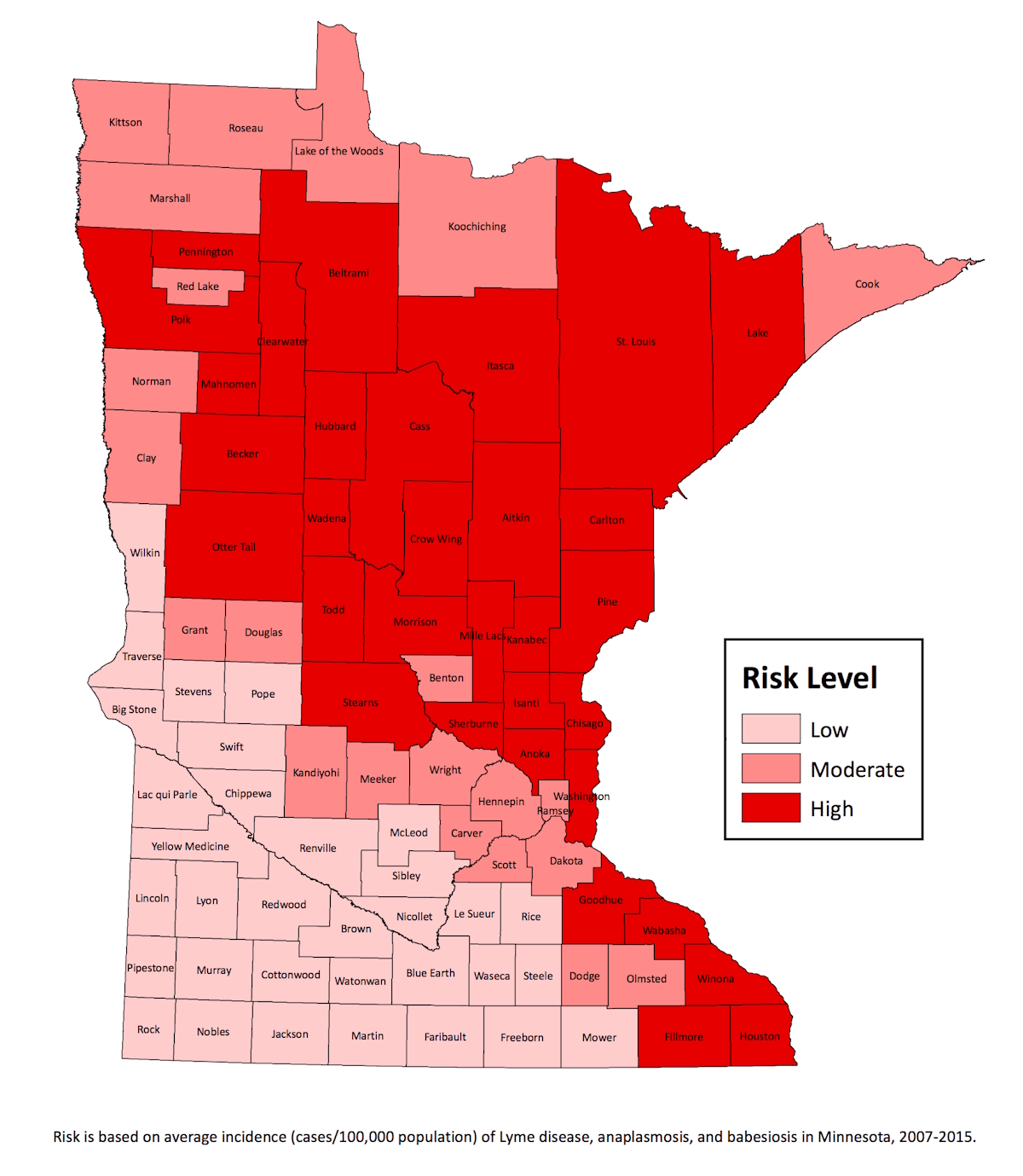 Minnesotans across the state are at risk for acquiring tick-borne diseases. The highest risk is in the southeast, east central and north central areas of the state. Grassy fields, brush-filled wooded landscapes and places where residential neighborhoods meet the forest edge are prime tick habitat. Our brochure contains information to help you mitigate your risk for Lyme and other tick-borne diseases.
